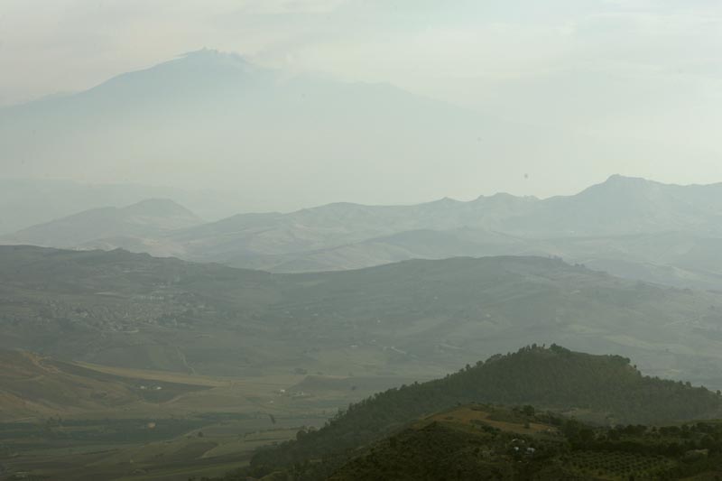 The view of Mt Etna from the ruins of Morgantina, in the center of Sicily. As in ancient times, the region is considered the bread basket of Europe, known for its fertile volcanic soil.
