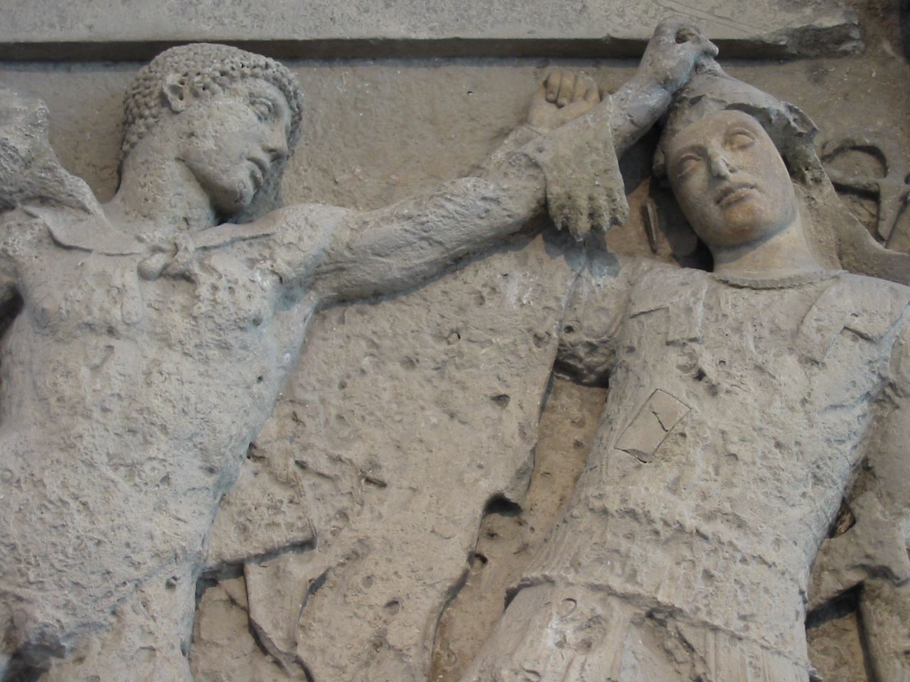A dramatic scene from an ancient metope, which adorned the side of a Greek temple.