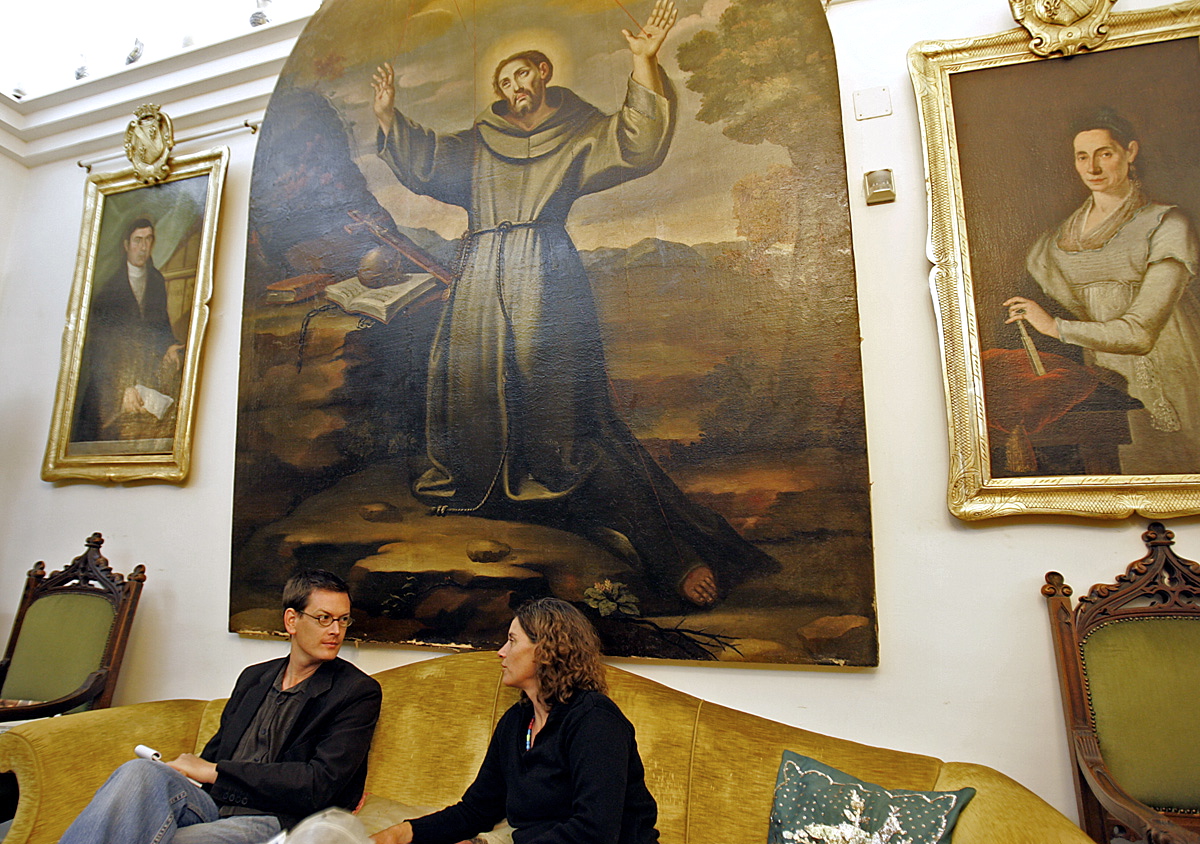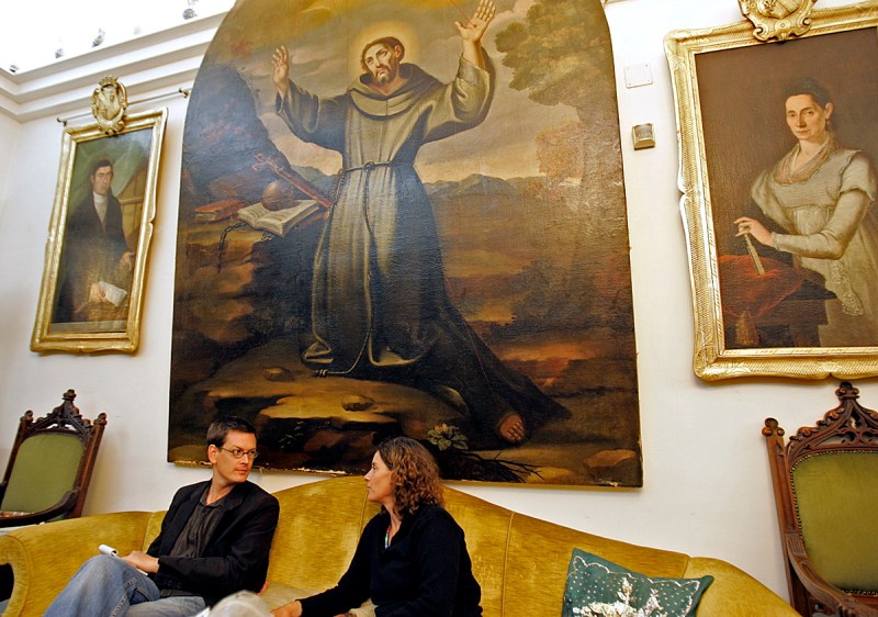 Jason Felch and Livia Borghese interviewing a local art dealer in Sicily.