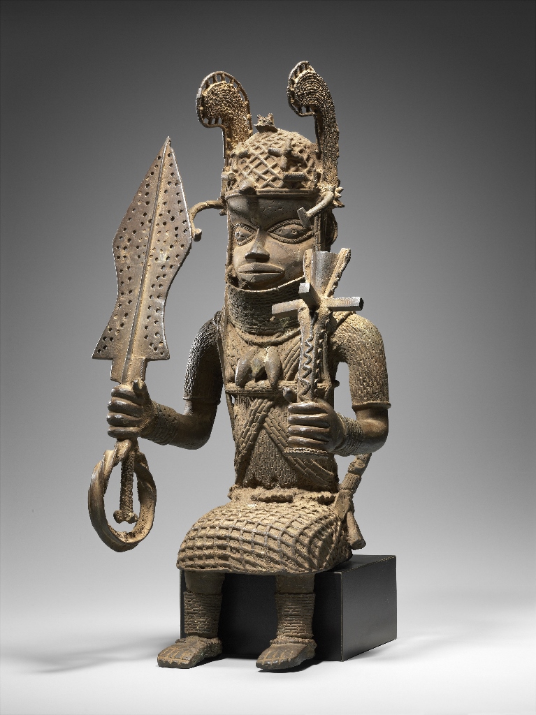 A brass altar figure from the Benin people, seen at the top of his post, was apparently stolen from an ancestral altar in the Royal Palace of Benin City before the Davis Gallery acquired it in 1997. As the MFA states, “Although the figure was accompanied by documentation that appeared to authorize its sale by the chief of the guild of Benin City’s brasscasters, or Igun Eronmwon, inconsistencies within the bill of sale, as well as recent correspondence from the office of the Director General, National Commission for Museums and Monuments, Nigeria, have cast doubts upon the authenticity of this document.” An 18th century Edo head, below, was also acquired by the gallery in 1990 from the Benin brass casters.
