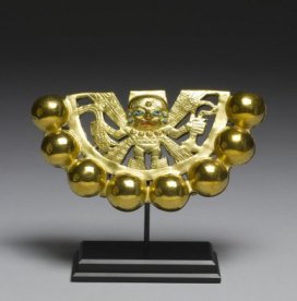 The Bourne collection (now the Walters collection) includes a piece widely attributed to Sipán, a golden belt rattle (left) [Note: An earlier version of this post had an incorrect image. The mistake was ours, not Atwood’s.] It wasn’t on display when I visited Baltimore but it appears in the catalogue, which calls the piece “Moche style, North Coast, Peru.” The Sipán tomb was looted by the Bernal brothers in February 1987. Its fabulous artifacts spread quickly through the elite antiquities racket before police fenced off the site and allowed archaeologists to excavate it. They found two more, undisturbed tombs that have enriched our understanding of pre-Columbian society.